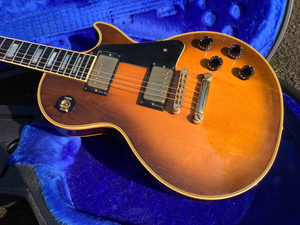 Here a cool Gibson Les Paul Custom. It’s a made in USA 1985 Tobacco Sunburst model and is a superb example of a fine solid body guitar. The guitar is in great condition with some discolouration and fading of the Tobacco Sunburst look, down to a dirty honey burst appearance. There is also an ample bit of yellowing of the binding across the guitar and headstock. This beast is, with its killer looks and awesome sound also a real winner. The fretboard is a very fine grain ebony, which in places has worn away a bit. Th frets themselves are original frets with the binding nibs still present, however, the frets are a bit low too and make the guitar play very easy. The guitar balances quite well and the neck handles very well. Guitar lives in a black coloured chainsaw hard-case.