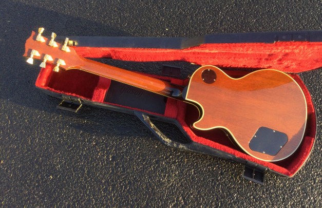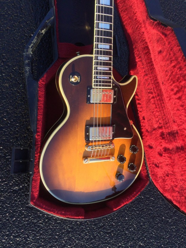 Here a traditional Gibson Les Paul Custom in Tobacco Sunburst with a brown back and neck. It’s a 1988 model and is a superb and cool looking guitar. The guitar is in great overall condition with only minor tarnishing on the pick up covers giving it patina and bit of rock mojo. With its fantastic feel and killer looks, and awesome sound it is a real winner. The fretboard is dark ebony and the mahogany neck plays light and fluid. Guitar lives in its chainsaw hard-case.