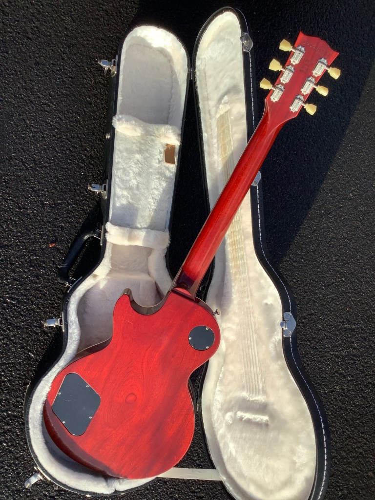 Here a cool guitar from the Gibson stable, a great looking Slash signature model in Vermillion Les Paul Standard model. Great guitar with a super reddish flame type top on it. This guitar has seen some minor use at all and has nearly no marks to body, other than some indentations on the front and is therefore in great condition. The pick-guard was never fitted and no drill holes are present on the body. The overall playability is superb and the guitar has a cool look about it. The construction is solid mahogany back and neck, maple cap (AAA grade) and very dark rosewood fingerboard. There’s some weight relief to the bodies, despite this these are hefty beasts; averaging around 4.1kgs The face of the headstock has a silkscreen print of Slash’s signature on it. Set up nice and low it plays like butter. Lives in its black Slash motif adorned hard case.