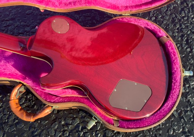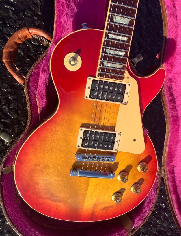 Another quality guitar from the Gibson stable, a great looking 30+ year old Cherry Sunburst Gibson Les Paul Standard model. Great guitar with a lovely understated flame top on it. The immediate 1990s falls in were considered a so called “good wood” era and Gibson guitars were made to a high standard. This guitar has seen use and has some but minor marks to body and neck and is in great condition. The playability is superb and the guitar has an amazing tone about it. Set up nice and low it plays like butter. Lives in its tan coloured case.