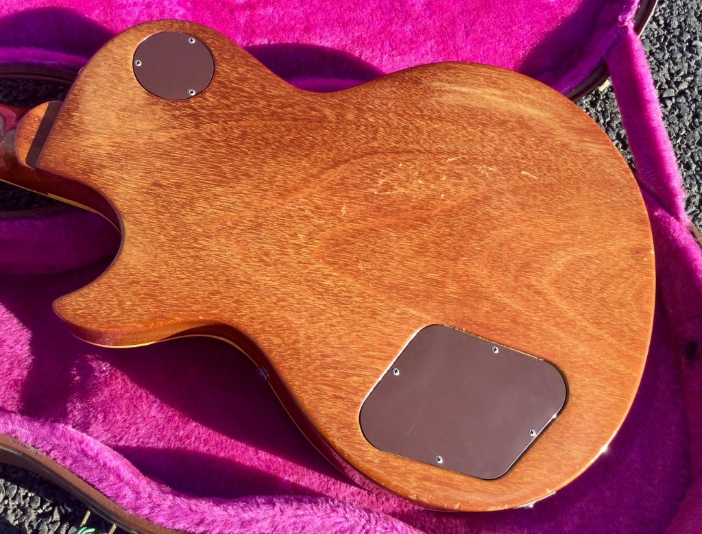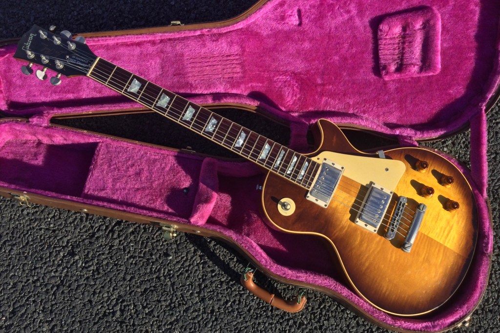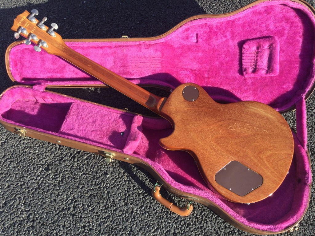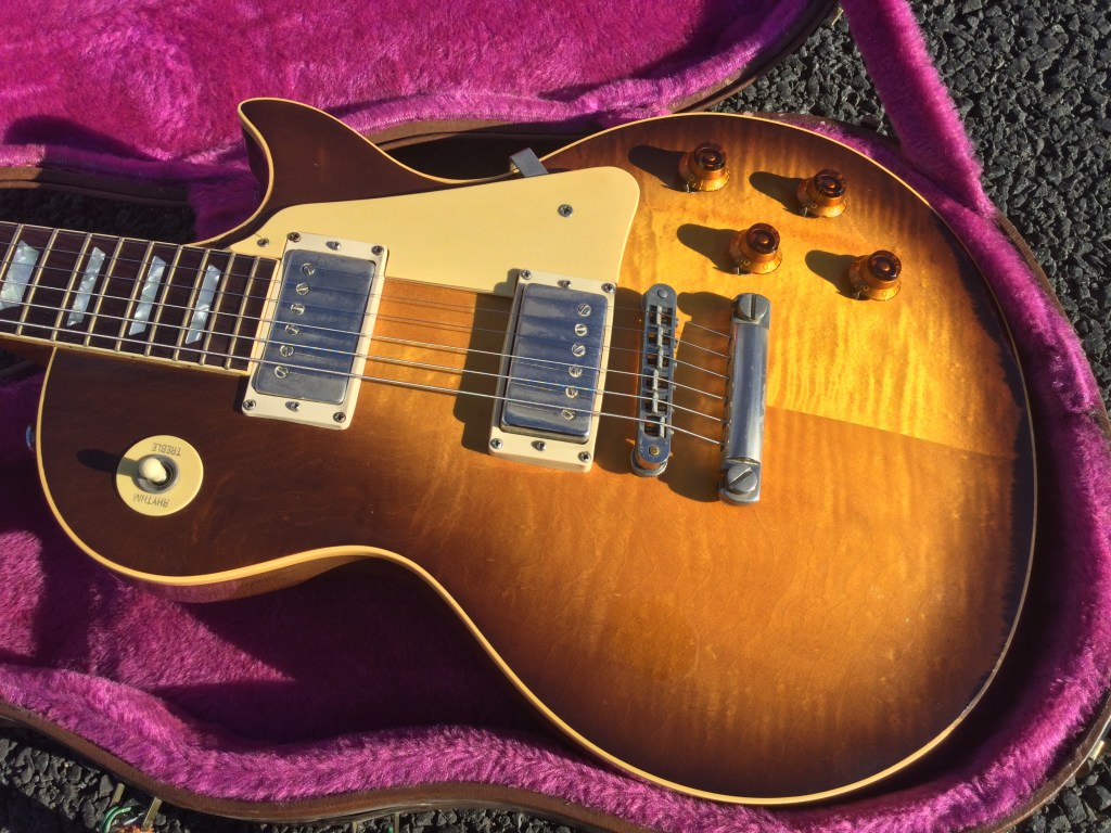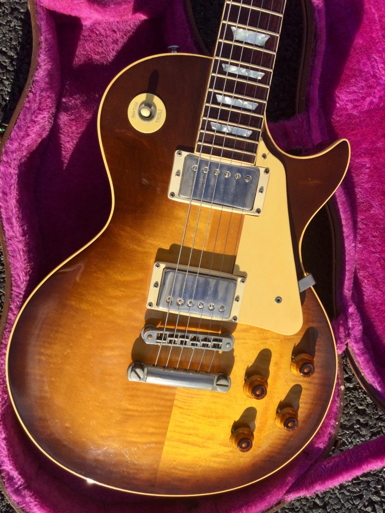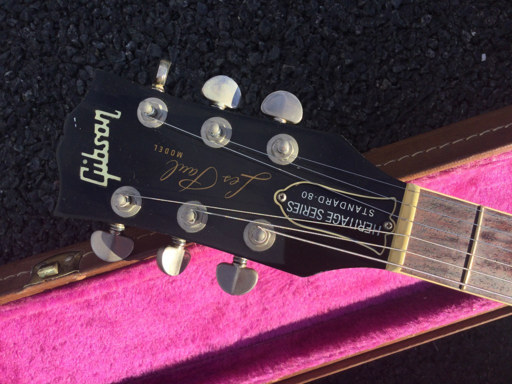 Here another 1980/1 Heritage series  Gibson Les Paul Guitar with cool looks due to its lightly flamed orange/honey finish. Not a screaming loud finish but very nice maple top and a killer sound to boot; for those who know the Gibson Les Paul Historic Heritage range, you will have seen some great examples of Gibson’s luthiers’ craftsmanship. However, this one is quality and like the purpose of the Heritage series they are close replica cousins to the 1958/9 Gibson LP series. An R8/9 prehistoric, close to the vintage original, in an early, 1980 reissue.
