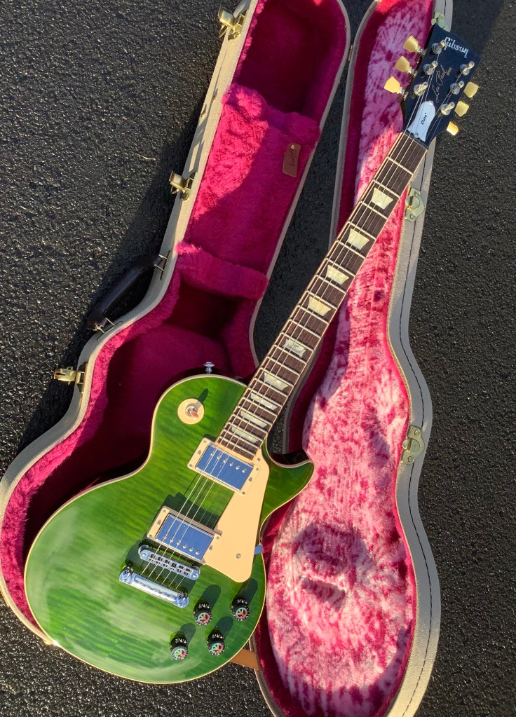 Here an interesting guitar from the Gibson stable, an Mellow Green Burst Gibson Les Paul Peace model, made as part of the 120-year anniversary of Gibson’s guitar building. Great guitar with a mahogany body and neck and a fine figured maple top on it. This guitar was made in USA in 2014, and comes originally with robot mini E-tune system automatic battery operated tuners. The Gibson Les Paul Peace model references the Flower Power era of the ’60s with some fittings including Peace symbols in the volume and tone knobs as well as the PEACE lettering on the tailpiece. The guitar lives in a hemp-covered case, with its peace sign and tie-dye interior in spirit to the look of the 60s. The powerhouse of this guitar are 2 Gibson 61 humbuckers arranged in the usual 2 Vol/2 Tone array The guitar has a slim Taper profile on the neck making playing quite easy. This guitar has seen little or no use use and has only polishing marks to body and is in great overall condition. Set up nice and low, it plays like butter.