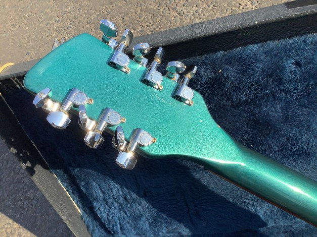 Here a Rickenbacker 330/12 in a Metallic Teal finish, made in USA in 1992 and is a stunning guitar. The 330 design appeared in the 1960s and has been updated over time to incorporate modern upgrades like Schaller tuners and Hi-gain pickups. The guitar has a classic sound and has the now well recognisable Rickenbacker look. The sound is quite twangy and made a a house hold tone by bands like the Jam in the 1980s. The neck has an easy accessible 24 3/4″ Scale Length, a bit shorter than the average Fender Strat, but bang on the Gibson LP range. The guitar body and neck are typically made of maple and the fingerboard is lacquered rose wood. Tuners are Schaller chrome type tuners. Guitar lives in its hard case.