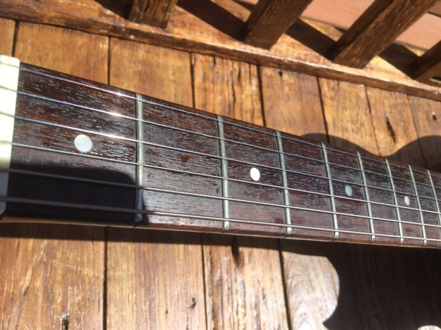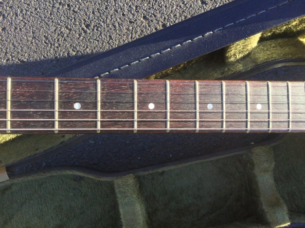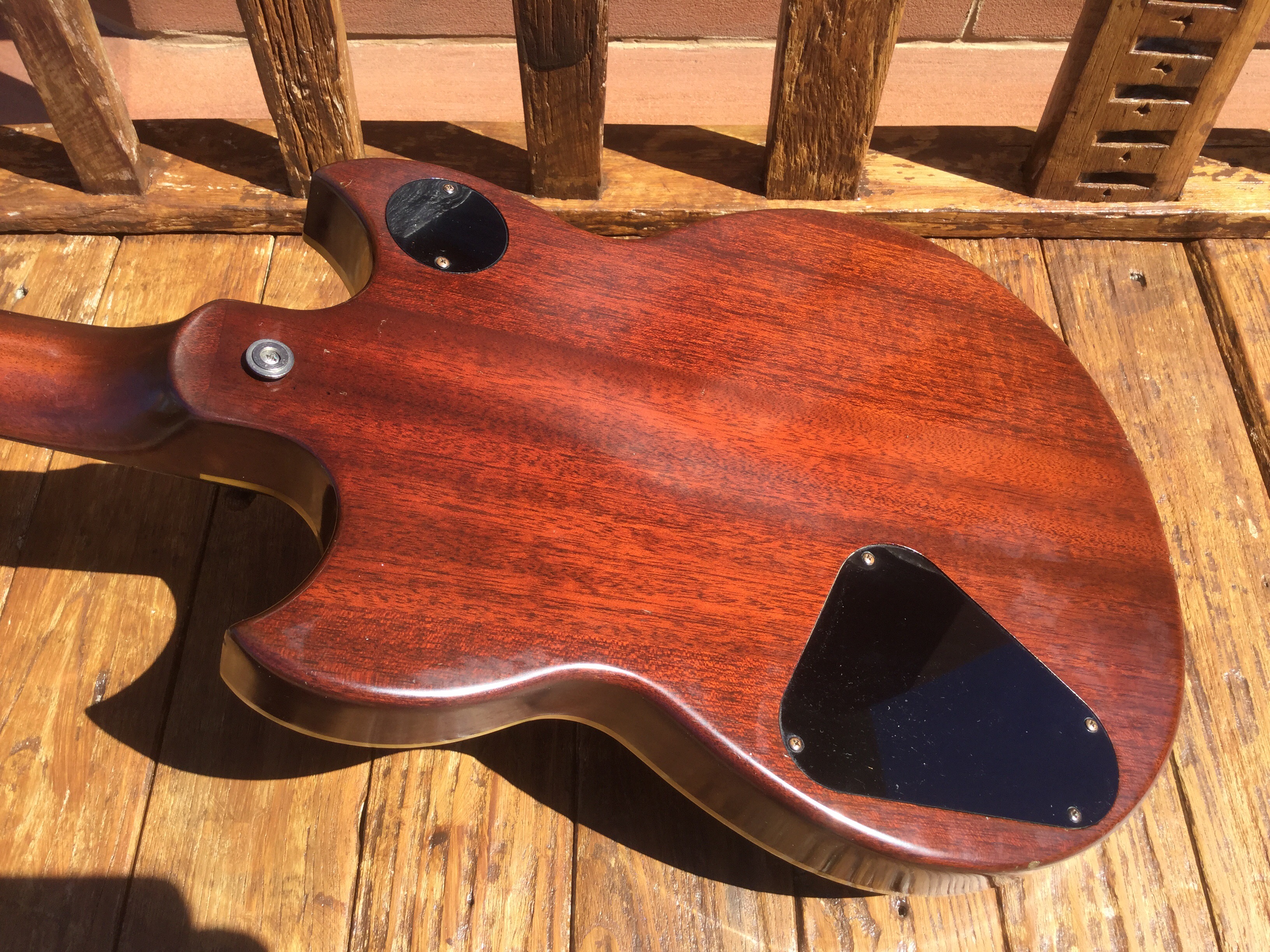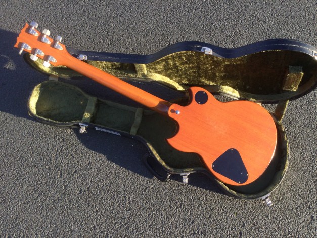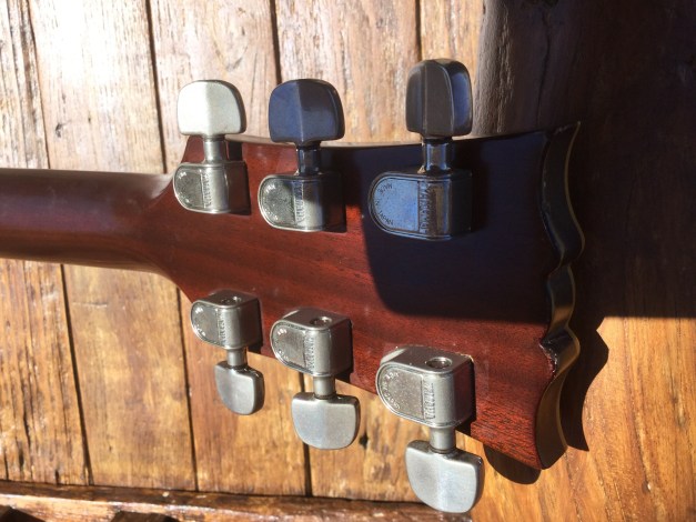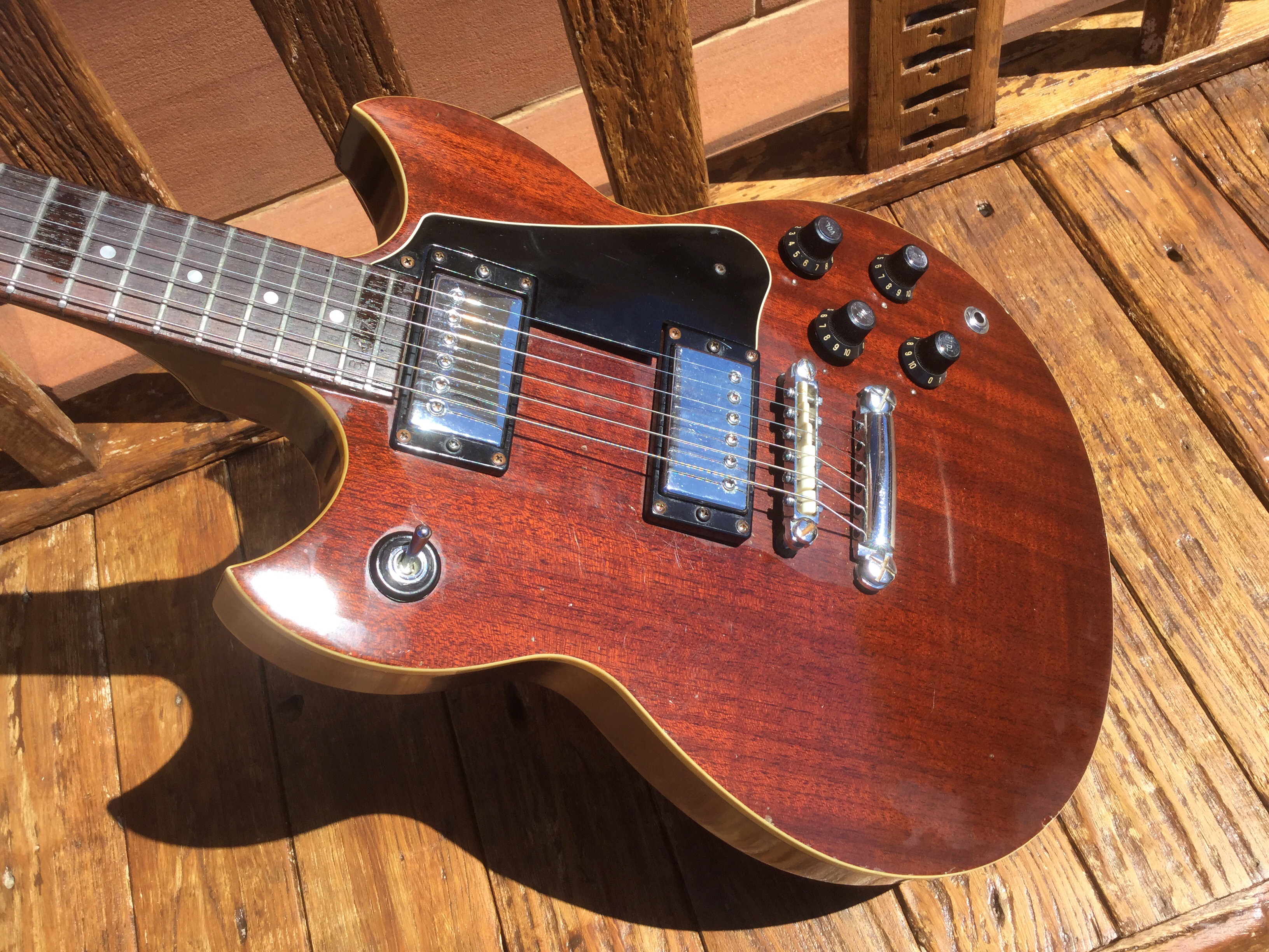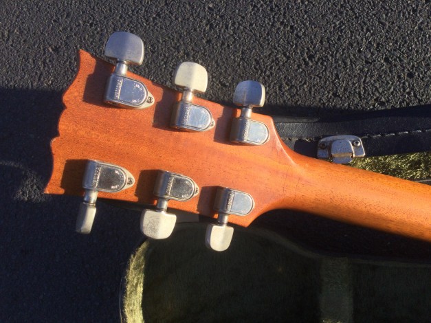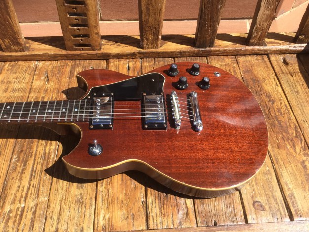 The guitar has a solid Honduran mahogany body with a set neck, rosewood fret board with mother of pearl dot position markers and embossed serial number, Chrome Hardware and Tuning pegs. The sound is through 2 high output Yamaha pick ups. The guitar has aged nicely with its binding nicely faded to a clotted creamy colour. Yamaha SG-90 guitars were made from 1974 till 1975 in translucent Black, Natural Wood, Walnut and Red. Notable players of this axe included Barney Kessel and Andy Taylor of Duran Duran.