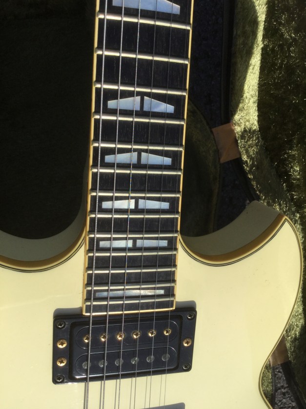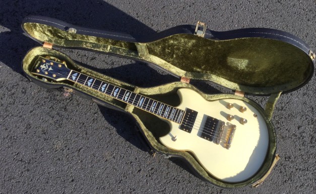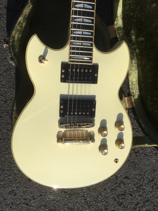 Unusual and stunning Yamaha SG-1000-24 in aged cream finish. Of all the set neck type Yamaha SGs, this is the rare 2-octave 24-fret version. The SG-1000-24 is an upgrade from the SG-1000 and this model like all early SG-1000 models is kitted out with Alnico V high output Pick ups. This guitar is a real gem, ebony fingerboard inlaid with pearloid fret markers. The guitar itself plays like a dream, light and fluid, and has been set up with a nice low action. As with many mid 80’s guitars from the Yamaha stable, the finish has aged a bit with a yellowish lustre due to aging. Despite being 30+ years old, guitar is in real good condition with, only some tarnishing of the brass hardware creating a nice patina and giving the guitar ounces of mojo. Like most SGs, this guitar is quite heavy, Tonewise this particular model is kitted out with coil taps, giving an enormous range and variation. Weight of guitar approx. 4.4 Kgs, neck width at nut approx. 4.2 cm.