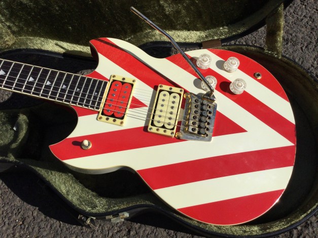 Here a rarity, a Yamaha SG-1000XU, a factory issued modified Yamaha SG-1000 from 1984. One of a very few with a arrow-shaped headstock instead of the open book shaped. Apparently this was a limited release issue and seems to be associated with a tv series for youngsters in Japan in the 1980s. The guitar plays very much like the Yamaha SG-1300T and is equipped with pretty much the same Rocking Magic tremolo system. Coil tapping options are part of the spec and unlike the 1300T, it has 2 vol /2 tone control systems common on a standard SG-1000. The neck however, is set flush with the body almost resembling an SG-1300 T with a arrow shaped head stock. Guitar lives in its shaped lined hard case.