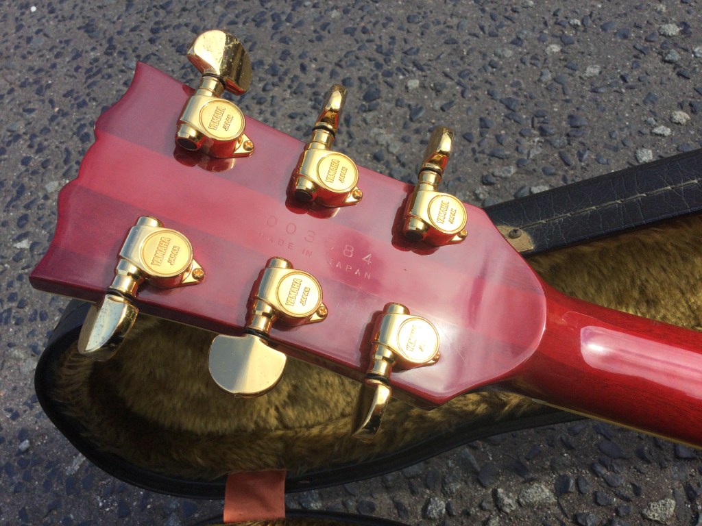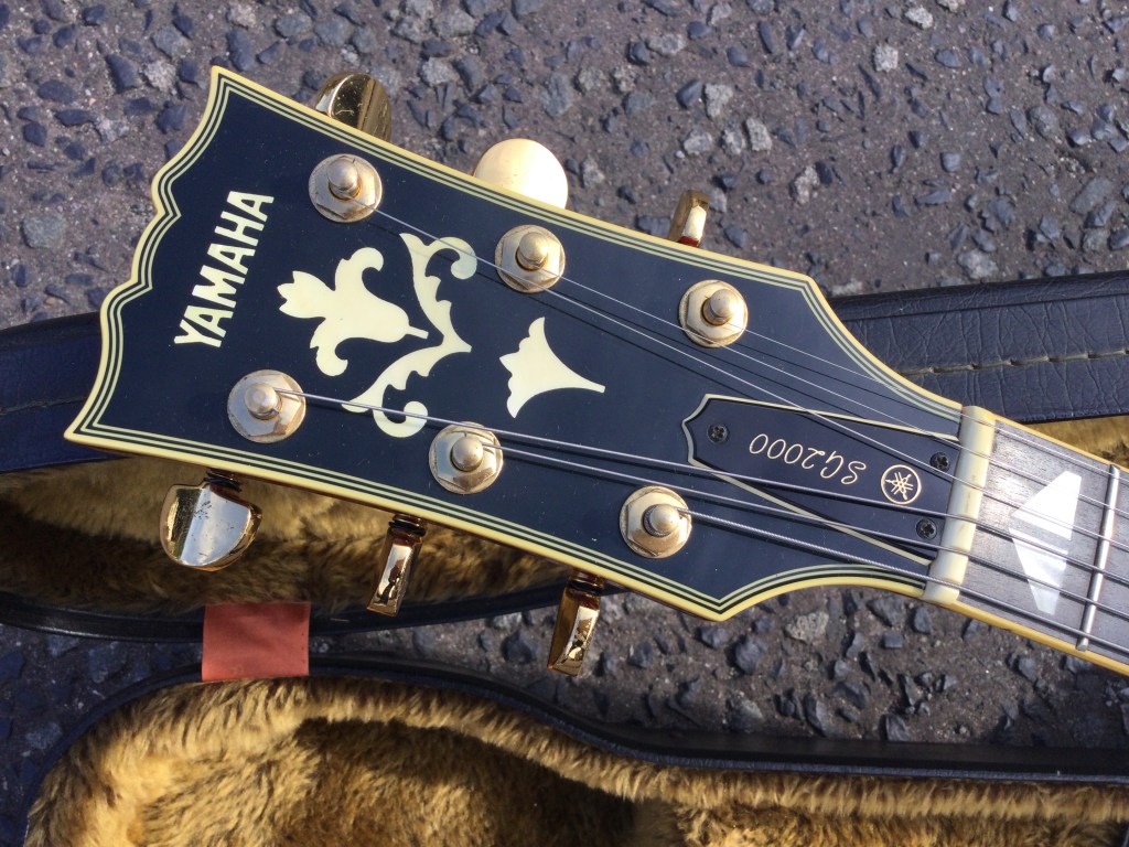 Here a 1st issue Yamaha SG-2000 in Cherry Sunburst finish from 1979. This early Yamaha SG-2000 model was built from maple and mahogany with a mahogany thru body neck in a so-called “T-cross construction” mode. The fretboard is bound ebony with mother of pearl/abalone split wing style inlays. Typical weight of these models was around the 4.4 kgs. Hardware was gold plated with a gold stop bar. In order to aid sustain the SG-2000 has a brass sustain block under the bridge. This search for sustain was a modification to early SG’s based on suggestions from Carlos Santana. The sound of this model is strong, coming from 2 Alnico V semi open humbuckers. The electronics are controlled with 2 Amber Speedial 2V/2T Push/Push Coil Tap on tone pots and a 3 way toggler switch. Guitar is all original and lives in its original lined hard case.