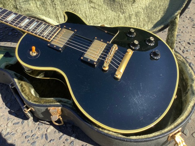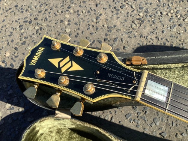 Here a rare Yamaha LP-800 C, the 1980s top of the range version of Japanese Yamaha Les Paul model, these models were produced during the late 1970’s till the late 1980s, along the well known Yamaha SG range.This Yamaha LP-1000 Custom was produced in Yamaha’s Matsumoku’s Custom shops and was deemed the top type of the Yamaha Les Paul model (SL/LP) range. The guitar sports a solid body, fitted with a set neck, ebo fretboard, gold hardware, dual metal covered Yamaha Humbuckers. The guitar body is decorated with mother of pearl fret markers and cream binding that has beautifully aged to a cream yellow hue. These were much more than Yamaha’s Gibson Les Paul copies, these were solid quality guitars built from quality wood and materials. A quality vintage guitar, killer looks, great tone and sound and oozing of mojo and vintage vibe.